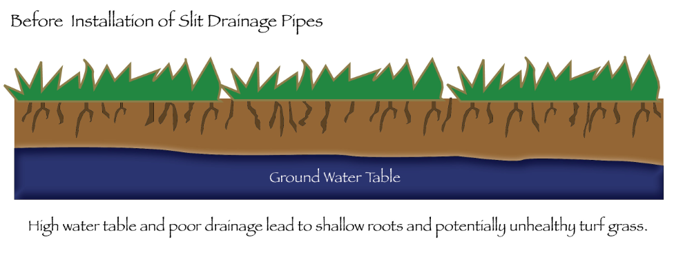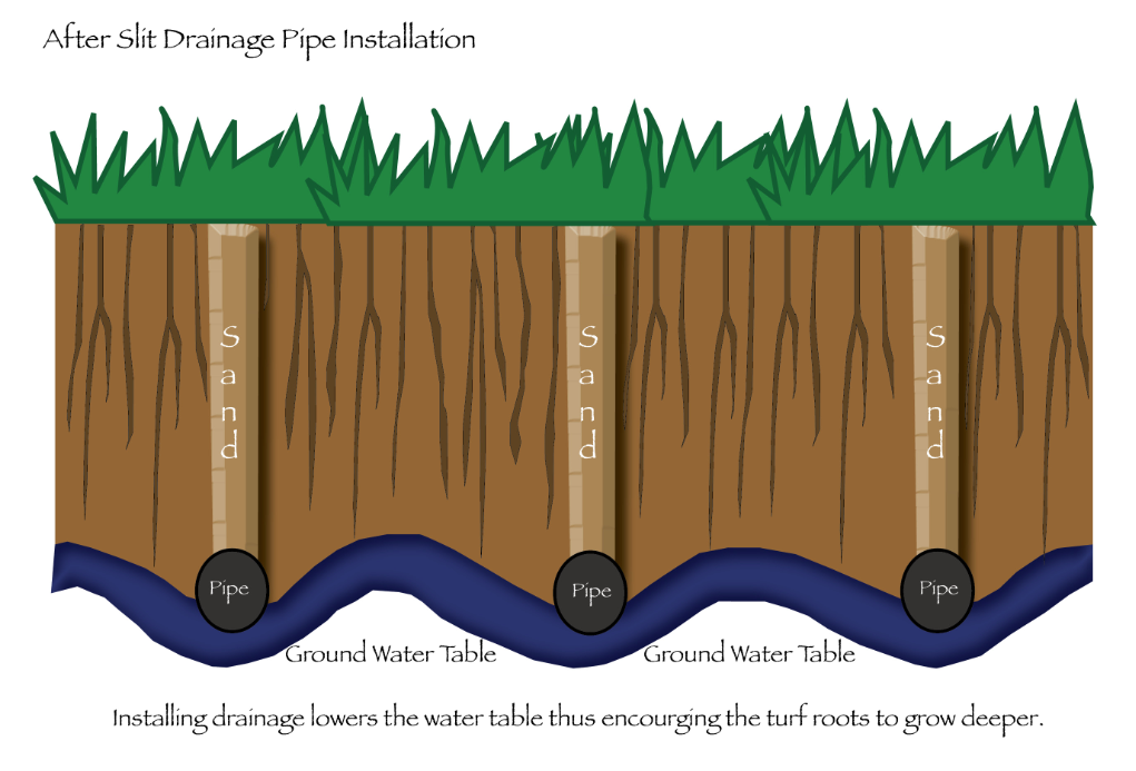 Do you have standing water on greens, tees or fairways? Is your turf suffering from shallow roots, limited pore space or lack of nutrient uptake? Soil drainage is critical to healthy turf as we all know the detrimental effects of poorly drained soils. A great amount of time and money is poured into highly performing irrigation systems intended to deliver water quickly where deep soil percolation rates may not match the water application rate. The buzz surrounding recent advancements in greens drainage systems are not new, Environmental Solutions has implemented small diameter drainage for years. The tools we use reduce or eliminate damage that a green can incur during installation that may undermine successful drainage improvements. We respect the turf by utilizing AFT equipment, HDPE turf mats, float tires, tip carts and appropriately sized equipment to eliminate any turf disruption. In addition to traditional drainage systems with collectors and interceptors, slit drainage is a minimal impact method for removing standing water on golf course features. Depending on the severity of the site, we can also force water evacuation where gravity fails with sump pumps and chambers.